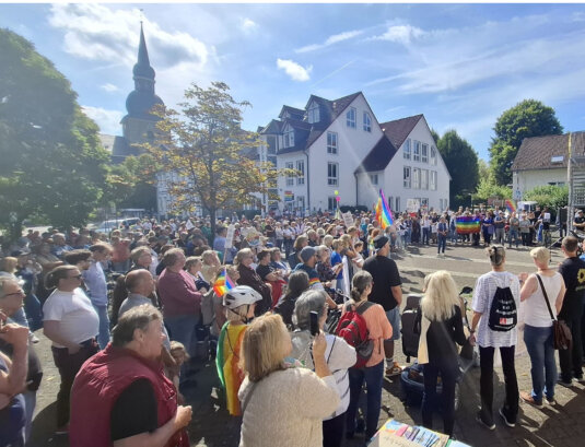 Rund 500 Personen nahmen an der von den OMAS GEGEN RECHTS - Sprockhövel und 26 Partnern organisierten Demonstration teil. Auf der Abschlusskundgebung sprach Bürgermeisterin Sabine Noll und bekräftigte das Engagement der Stadt Sprockhövel für 'Demokratie und Menschenwürde'.
